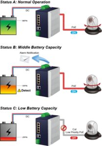 Anywhere in the city without direct AC electricity can use the BSP-360 PoE Managed Switch. You may examine the current energy usage and battery state in your office using the BSP-360's configuration interface with PoE over Cat5 cable, wireless AP, and SFP media converter.