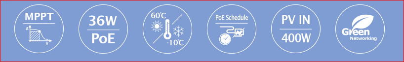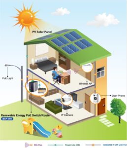 The BSP-360 Renewable Energy PoE Switch's expanded home-use capability enables SOHO/home users to quickly build an integrated network for the transmission of data and video. It incorporates a renewable energy system and IEEE 802.3at PoE technology. The BSP-360, which injects power through the Ethernet cables, perfectly complements the wireless AP and PoE IP camera devices, making it simple for SOHO/home customers to create an affordable and dependable PoE network environment.